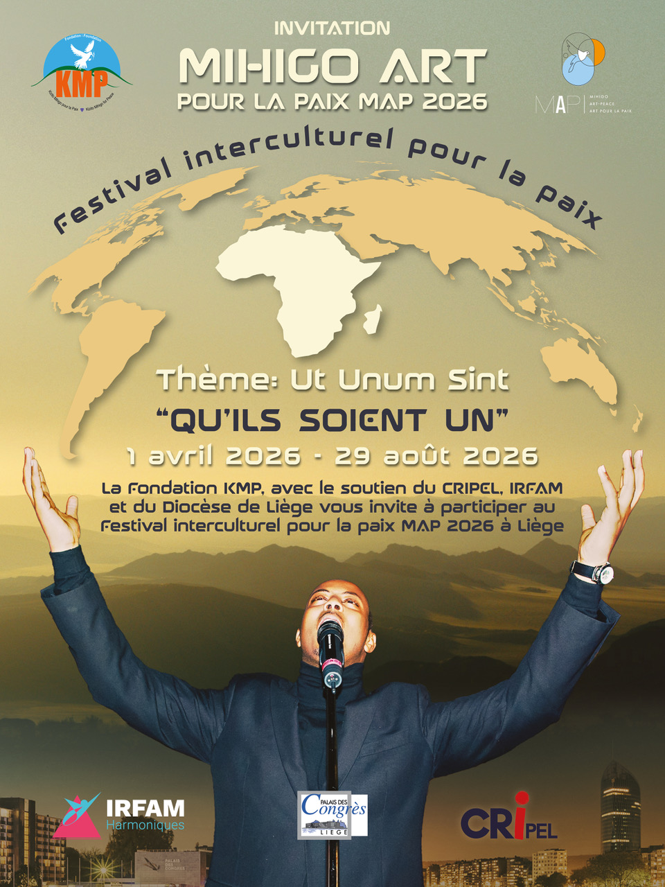 Le festival MAP – Mihigo Art pour la Paix est un événement interculturel dédié à la paix, porté par la Fondation Kizito Mihigo pour la Paix, en collaboration avec ses partenaires et avec le soutien du CRIPEL, de l’IRFAM et du diocèse de Liège. Organisé à Liège, il rassemble artistes, citoyens et acteurs engagés autour de valeurs essentielles telles que la paix, l’unité, la mémoire, la tolérance, la compréhension mutuelle, la cohésion sociale et le vivre-ensemble.